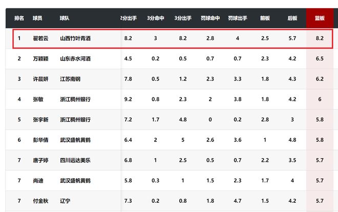 在篮板榜上,翟若云以场均抢到8.2个篮板排名第一,山西女篮万颖颖6.5个篮板第二,许晨妍6.2个篮板第三,张敏6.0个篮板第四,张宇新和彭华倩都是5.8个篮板并列第五。