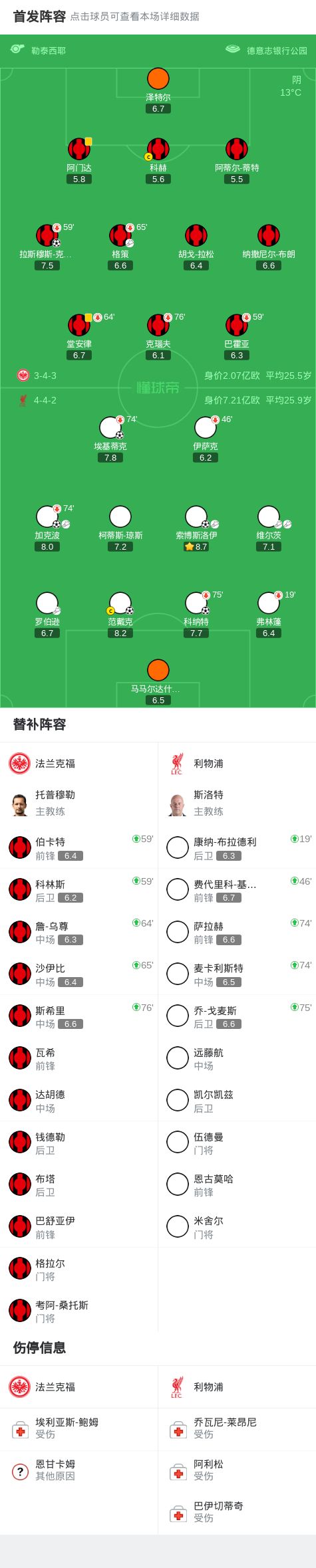 第44分钟,索博斯洛伊开出角球,科纳特头球破门,利物浦3-1法兰克福